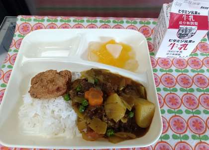 今日の給食は、「カツカレーライス」「牛乳」「フルーツゼリー」です。