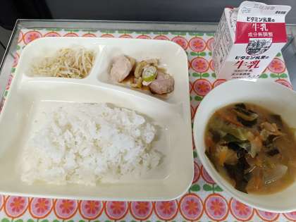今日の給食は、「ご飯」「牛乳」「焼き鳥」「みそ汁」「もやしのゆずの香和え」です。
