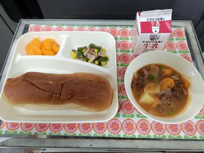 今日の給食は、「黒糖パン」「牛乳」「ビーフシチュー」「ベーコンとさんど豆のソテー」「みかん(缶)」です。