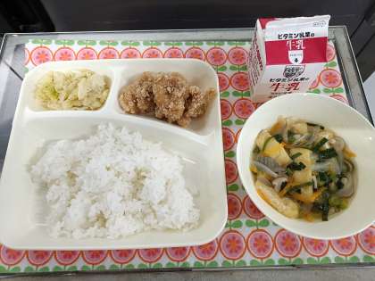 今日の給食は、「ご飯」「牛乳」「鶏肉の竜田揚げ」「五目汁」「キャベツの梅風味」です。