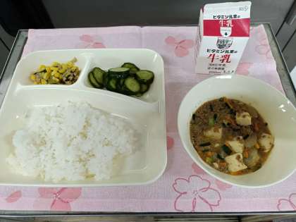 今日の給食は、「ご飯」「牛乳」「麻婆豆腐」「きゅうりの中華和え」「ツナとチンゲン菜の炒め物」です。