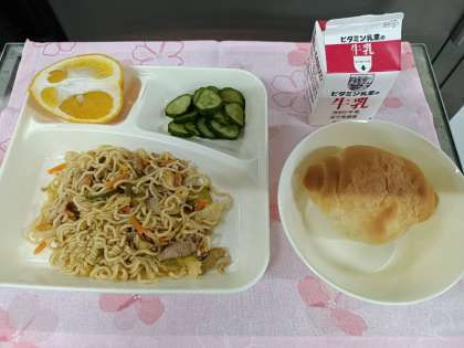 今日の給食は、「ミニコッペパン」「牛乳」「焼きそば」「きゅうりの生姜漬け」「甘夏かん」です。