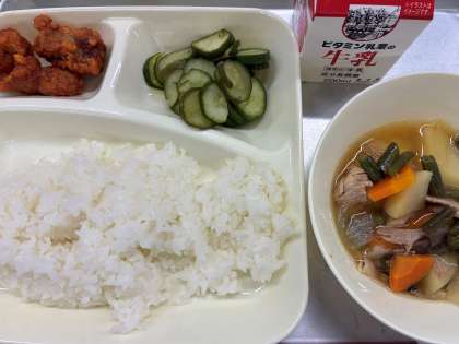 今日の給食は、「ご飯」「牛乳」「まぐろのオーロラ煮」「豚肉と野菜の煮物」「きゅうりの甘酢づけ」です。