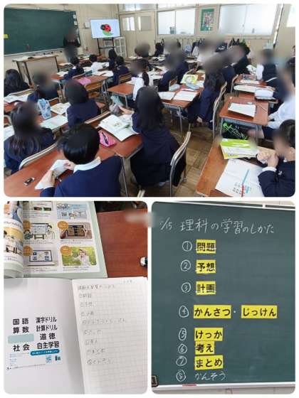 3年生の理科の学習です。今日は、初めての授業だということで、「理科の学習のしかた」について説明がありました。先生が用意したPowerPointを見て説明を受け、児童たちはとても楽しそうでした。3年生から初めて習う「理科」に興味津々でした!