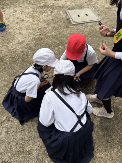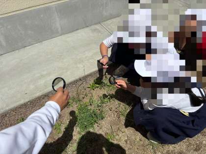 学習園に行き、さまざまな植物を探して虫眼鏡を使い、観察しました。