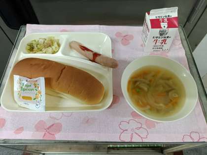 今日の給食は、「コッペパン」「アプリコットジャム」「牛乳」「ウインナーのケチャップソース」「スープ」「焼きツナキャベツ」です。