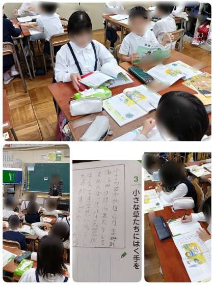 4年生の道徳「小さな草たちに はく手を」の学習です。小さな草たちにそっとはく手をおくりたくなった主人公の気持ちになりきって考えました。