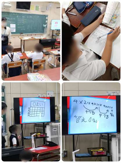 赤い紙40枚を4人に同じ数ずつ分けることや、青い紙0枚を4人に同じ数ずつ分ける方法を一人ひとりが考え、交流し、発表しました。色々な考えが出てきて、素晴らしかったです!