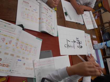 1組では、グループで話し合いながら、「72÷3」の筆算の仕方を考えました。