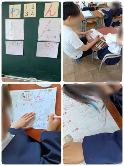 1年生の国語の学習です。ひらがなの「わ」と「ん」の書く練習をしました。