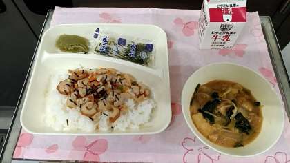 今日の給食は、「かやくご飯」「牛乳」「みそ汁」「抹茶ういろう」です。