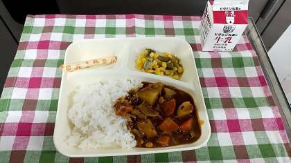 今日の給食は、「牛肉と大豆のカレーライス」「牛乳」「レタスとコーンのサラダ」「棒チーズ」です。