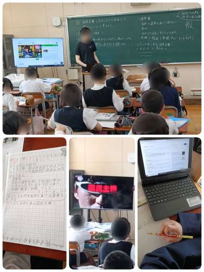 動画も見ながら、国民主権はどういったものなのかを考えました。タブレットを使って、調べ学習をしている児童もいました。生活の中で、国民主権が使われている場面(給食、通学路、選挙など)はたくさんありますので、もっともっと調べていってくださいね!