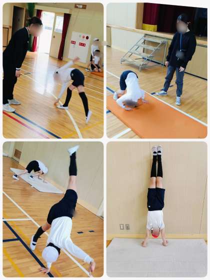 倒立や側方倒立回転、開脚前転など苦手な技や精度を高めたい技を一生懸命に練習していました。以前見た時より上達していて、努力の成果が見受けられました!これからも努力して、日々レベルアップしていってくださいね!