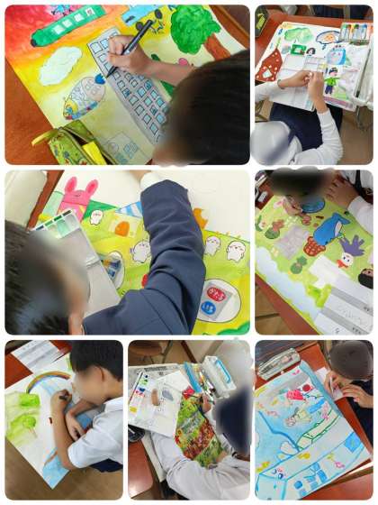 5年生の図画工作「あったらいい町、どんな町」の学習です。絵の具やサインペンを使って作品を創り上げました。