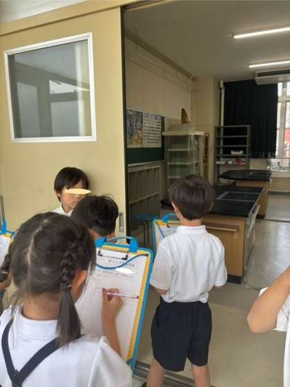 2年生に助けてもらいながら、学校たんけんをしました。普段は入らない教室や部屋をめぐって、何があるのか、どんなことをする部屋なのか、絵をかいてメモしたり、インタビューをしたりして学校のことをより深く知りました。