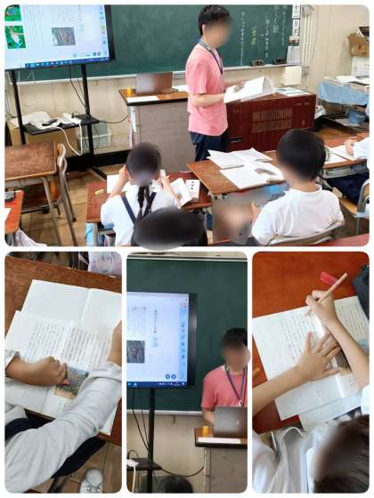 3年生の国語「自然のかくし絵」の学習です。先生の音読を聞きながら、自分で段落を見つけ、教科書に書いていきました。