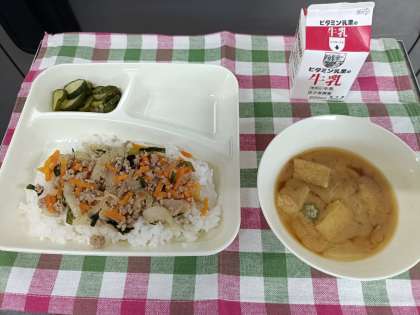 今日の給食は、「豚ひき肉とにらのそぼろ丼」「牛乳」「みそ汁」「きゅうりのゆず風味」です。