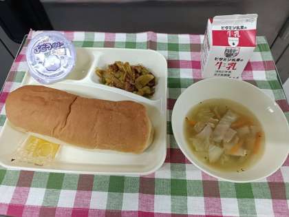 今日の給食は、「コッペパン」「マーマレード」「牛乳」「カレーマカロニグラタン」「てぼ豆のスープ」「ぶどうゼリー」です。