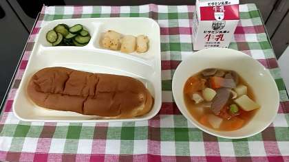 今日の給食は、「おさつパン」「牛乳」「イカ天ぷら」「フレッシュトマトのスープ煮」「きゅうりのバジル風味サラダ」です。