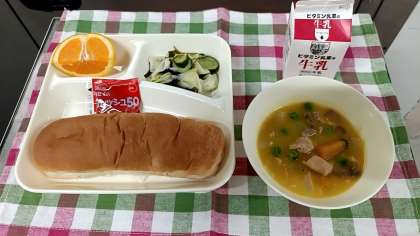 今日の給食は、「コッペパン」「いちごジャム」「牛乳」「鶏肉とかぼちゃのシチュー」「ミックス海藻のサラダ」「オレンジ」です。