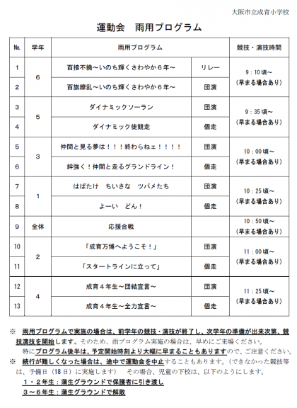 雨用プログラムで実施の場合は、前学年の競技・演技が終了し、次学年の準備が出来次第、競技演技を開始します。そのため、雨プログラム実施の場合は、早めにご来場ください。