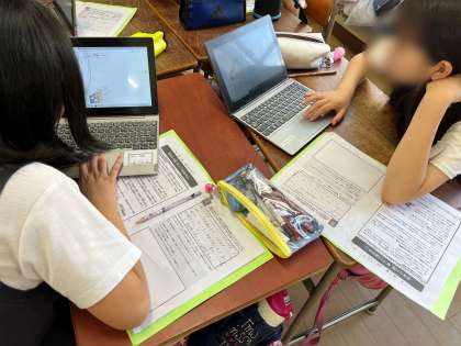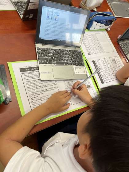 台風被害について書かれてある資料を読み、大事なことを要約したり、パソコンでハザードマップを見て調べたりしました。