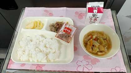 今日の給食は、「ご飯」「牛乳」「ゴーヤチャンプルー」「五目汁」「焼きじゃが」です。