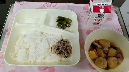 今日の給食は、「ご飯」「牛乳」「鶏肉と一口がんもの煮物」「オクラの梅風味」「ツナっ葉炒め」です。
