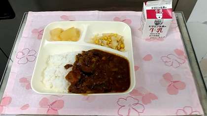 今日の給食は、「夏野菜のカレーライス」「牛乳」「サワーソテー」「洋梨(カット缶)」です。