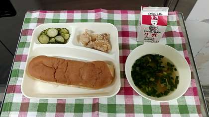 今日の給食は、「黒糖パン」「牛乳」「鶏肉のからあげ」「ハムと冬瓜の中華スープ」「きゅうりのピリ辛和え」です。