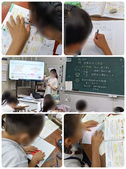 平行四辺形やひし形の対角線の特徴を見つける活動をしました。対角線の交わり方を定規や折り紙などで調べ、特徴を見つけることができていました!意欲的に活動していて、素晴らしかったです!