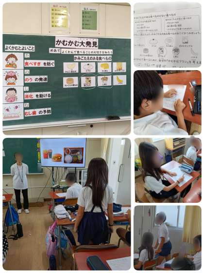 よくかんで食べることの大切さを知りました。かみごたえのある食べ物と、ない食べ物を知り、一人ひとりが自分の「かむかむプラン」について考えました!とても意欲的に授業に参加していて、素晴らしかったです!これからも食べ物を食べるときは、よくかんで食べてくださいね!