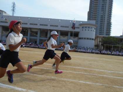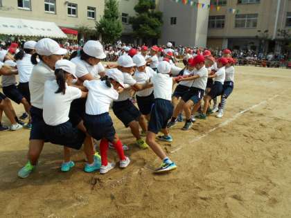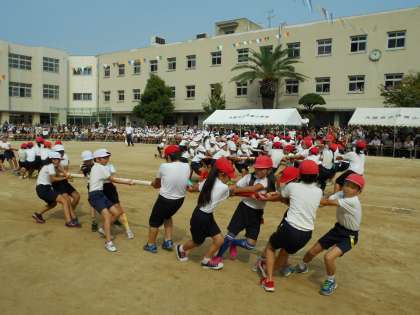 1本の棒を赤組と白組が引き合って勝負を決めます。運動場では9本の