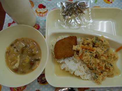今日の給食はカツ丼。具に卵が入るので、卵アレルギーの児童には