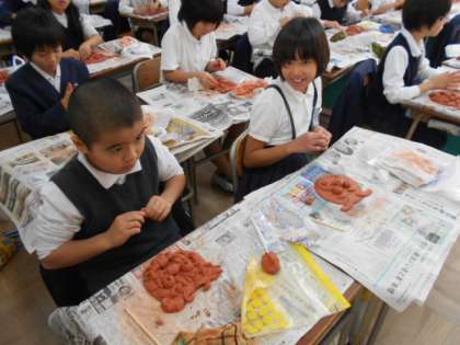 土を使って、個性あふれる思い思いのシーサーができあがりました。