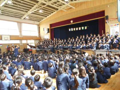 各学年がお祝いの出し物をしました。1年生は、手話をつけて「虹」