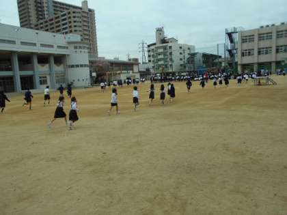 運動場の西側に非難した後は、担任の先生が人数確認を行います。逃げ