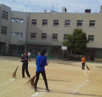 朝一番の全校朝会の後、児童は石ころ拾いをしました。放課後は、教職員
