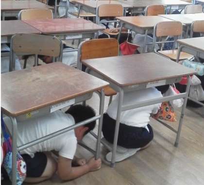 教頭先生の指示のもと教室では児童が机の下に入って身を守る行動をとり