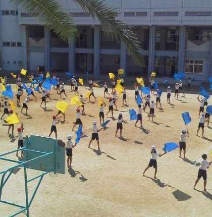 す。大きな旗を持って演技をします。最高学年としての自覚を高めなが