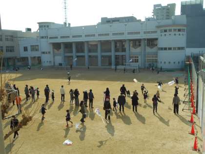 1年生は運動場で元気にたこあげでした。おうちの方には、たこ