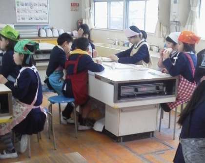 さんでできあがり。4〜6年生の混合グループで、和気あいあいと調