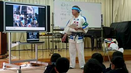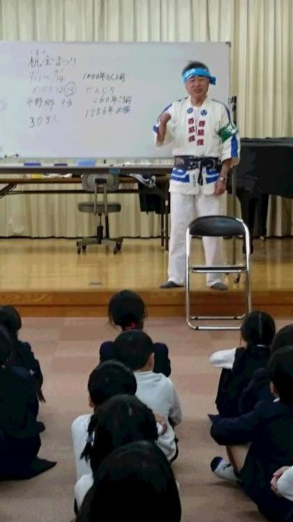 3月6日(火)多目的室で校長先生から祭りの授業がありました。平野郷夏祭りについて、お話を聞いたりDVDを見たりしました。はっぴ姿の校長先生を見て歓声があがりました。だんじりを引きまわす祭りが身近にあることにも驚いていました。