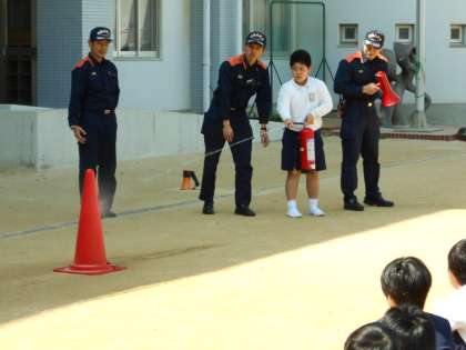 最後に、消火器の使い方の合言葉「ピン・ポン・パン」を紹介していただき、早速代表して、6年生の男子児童が、水消火器を使いました。