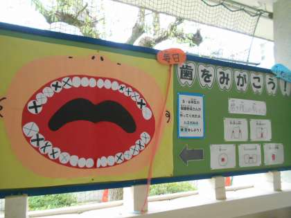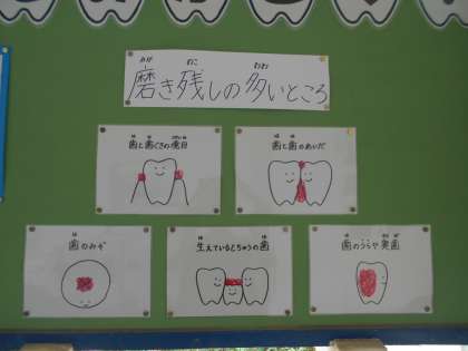 今、保健室の前には、「みがき残しの多いところ」の掲示物がはってあります。ぜひ意識して歯磨きをしてみましょう。「8020運動」・・80歳になっても20本以上自分の歯を保とうを目指してがんばりましょう。