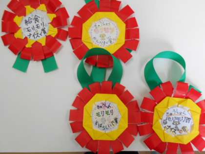 先日給食委員会で、各クラスの給食残食調べを行いました。3日間とも残食がなく、すばらしい結果だったので、給食委員会お手製のメダルが配られました。