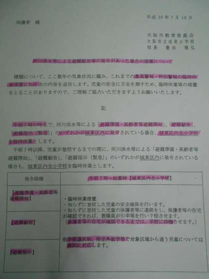 これまでの「暴風警報・特別警報の臨時休業措置」に加え、午前7時の時点で、河川 洪水などによる「避難準備・高齢者等避難開始」、「避難勧告」、「避難指示(緊急) のいずれかが城東区内に発令されている場合も城東区内全小学校を臨時休校とします。