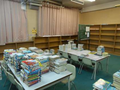 今、成育小学校の図書館では、図書館の本をデーターベース化するために、本棚からすべての本を出し、パソコンに「題名」「作者」「値段」「購入日」などを打ち込んでいます。