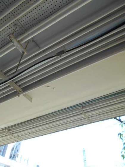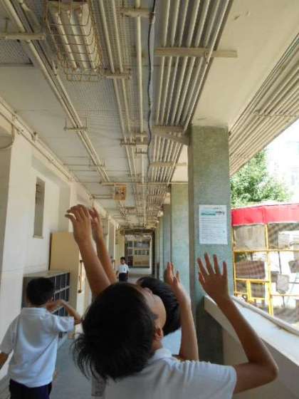 学校の廊下では、ミスト噴射を開始し、涼を求めて多くの子が手を伸ばしていました。